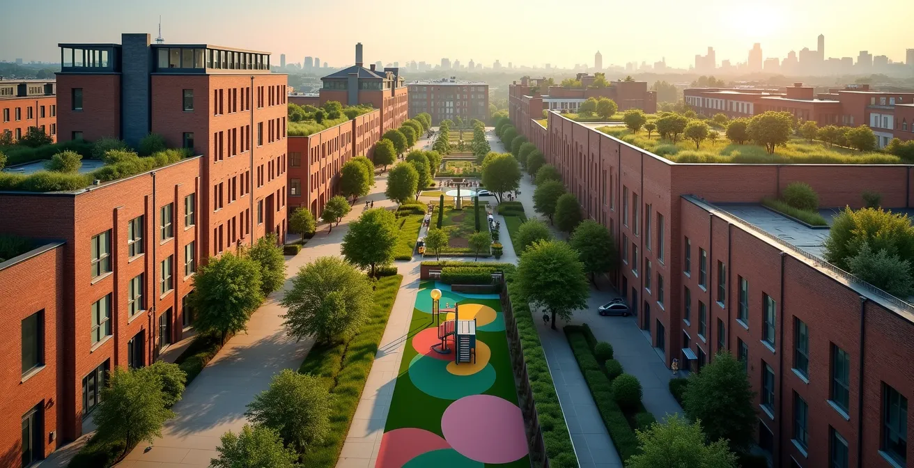 L’immagine di un’area industriale dismessa evoca spesso un senso di abbandono e degrado: capannoni vuoti, cemento fessurato e un potenziale economico e sociale sprecato. Per decenni, la risposta istintiva è stata la demolizione e la sostituzione con progetti immobiliari di lusso, un approccio che massimizza il profitto a breve termine ma spesso a un costo sociale elevato: la gentrificazione e l’espulsione delle comunità storiche. Altri approcci si limitano a interventi estetici, come un parco o una facciata rinnovata, senza risolvere i problemi strutturali di isolamento e mancanza di servizi.